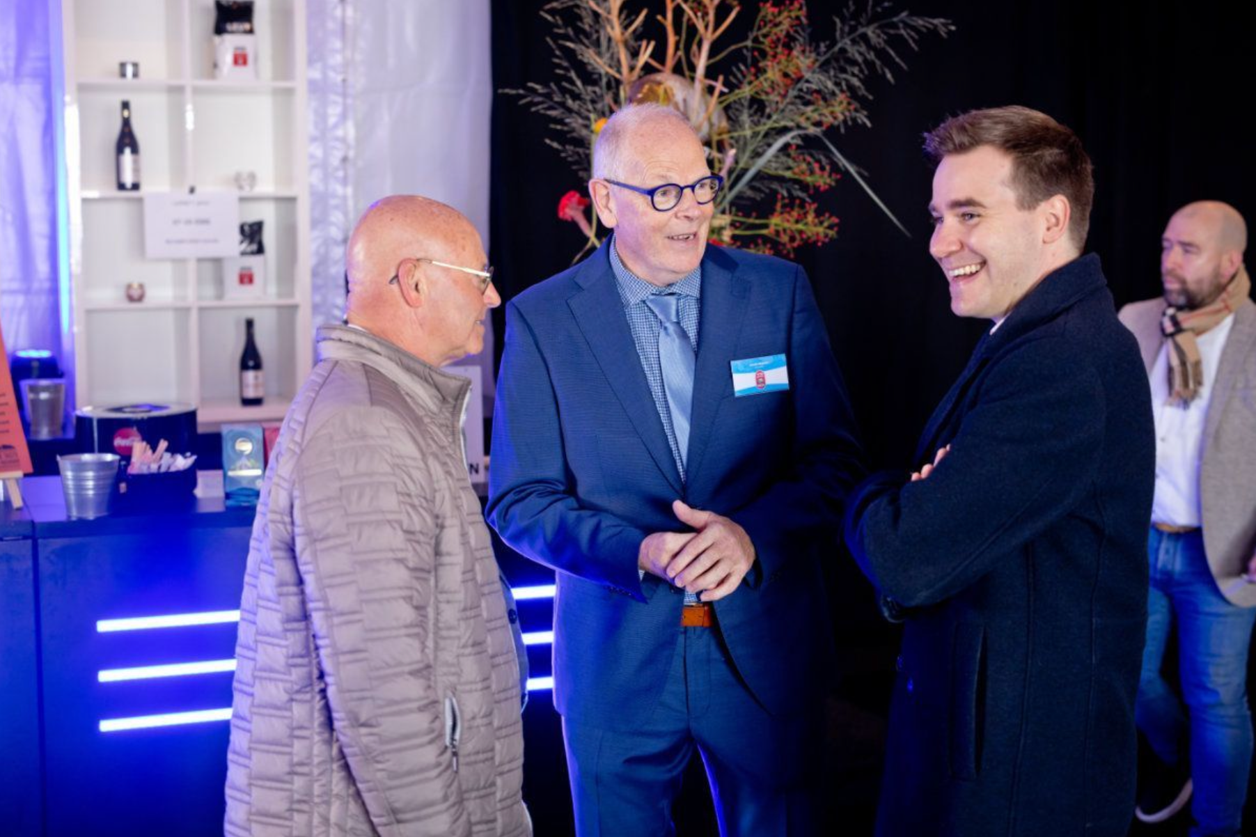 Voorzitter van de SVV Jacob Heijnen (midden) in gesprek met Rick Beukers, destijds wethouder in Bunschoten-Spakenburg (rechts) tijdens de Visbeurs 2024.